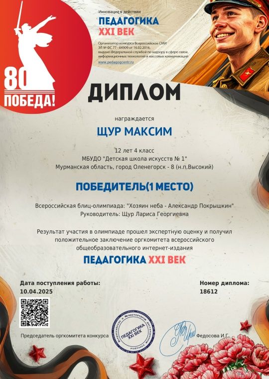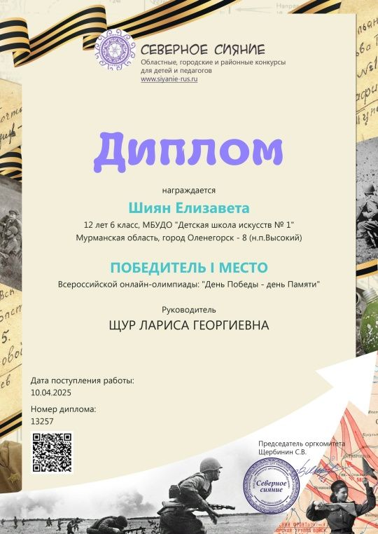 В рамках мероприятий, посвященных 80-летию годовщины Победы советского народа в Великой Отечественной войне 1941-1945 годов Шиян Елизавета приняла участие во Всероссийской онлайн - олимпиаде "День Победы - день Памяти" и заняла