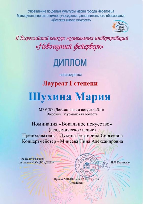 Поздравляем учащуюся отделения сольного пения Шухину Марию, преподавателя Лукину Екатерину Сергеевну и концертмейстера Минееву Нину Александровну с победой во II Всероссийском конкурсе музыкальных интерпретаций "Новогодний фейерверк" (г. Череповец)
