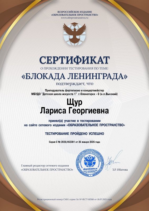 Щур Лариса Георгиевна и учащаяся фортепианного отделения Костюк Виктория прошли тестирование «Блокада Ленинграда».