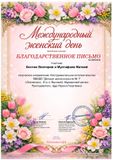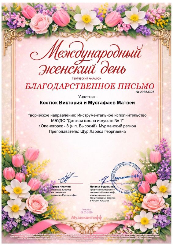 Костюк Виктория и Мустафаев Матвей приняли участие в Международном творческом марафоне проекта "Музыкантофф" "Международный женский день" и получили такое вот красивое Благодарственное письмо.