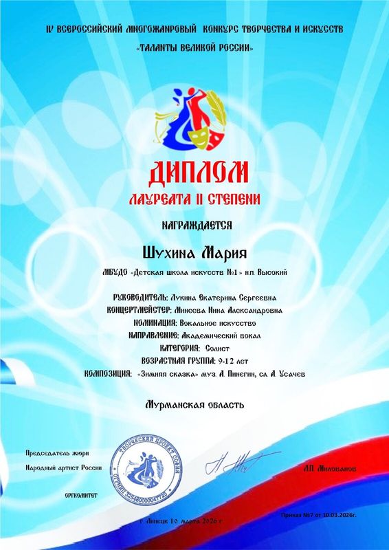 Поздравляем учащихся вокального отделения Невзорову Агнию и Шухину Марию с победой в IV Всероссийском многожанровом конкурсе творчества и искусств «Таланты великой России»