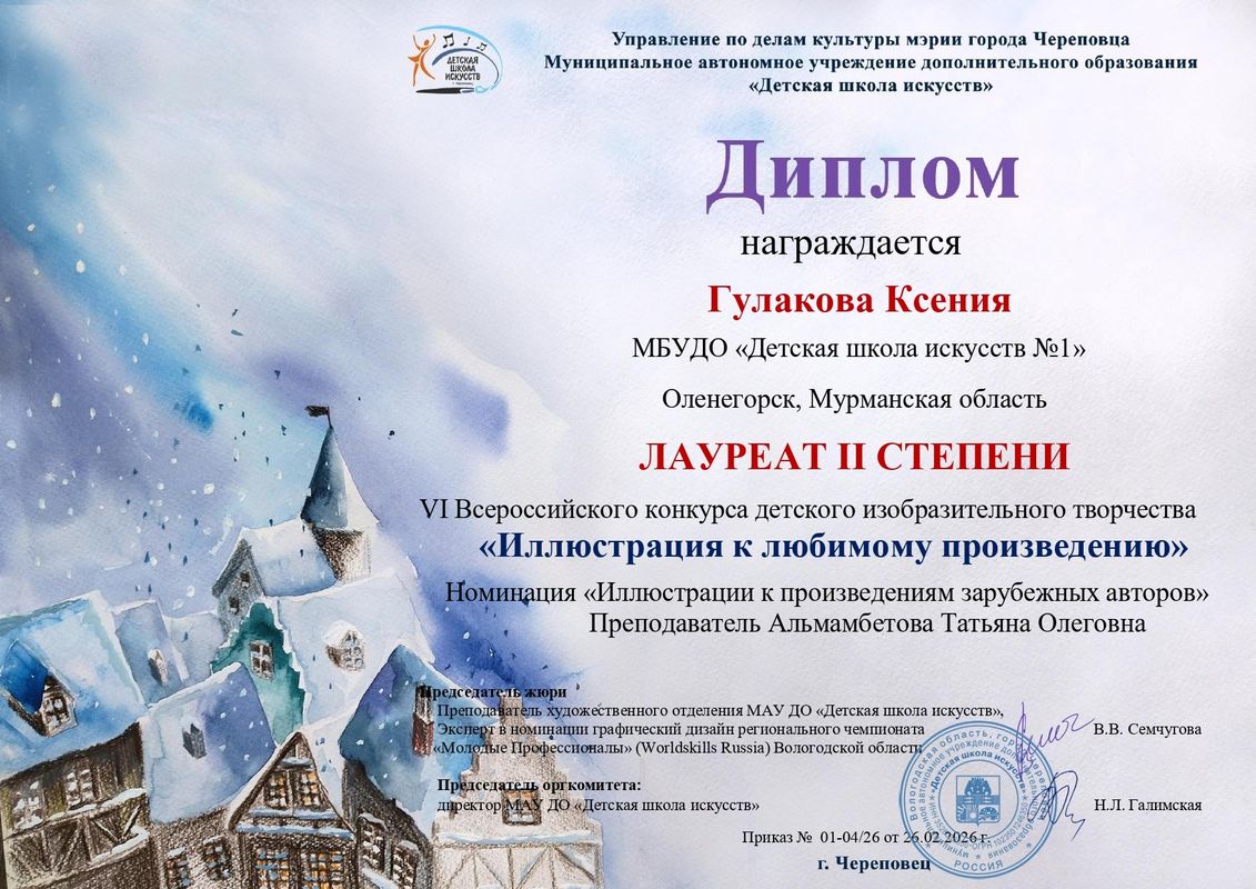 Поздравляем с победой в IV Всероссийском конкурсе детского изобразительного творчества «Иллюстрация к любимому литературному произведению» (г. Череповец) учащихся художественного отделения:
