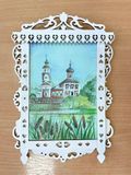 Миниатюрные композиции выставки - вид из окна на деревенскую улицу, старинные храмы, башенку старой крепостной стены - фрагменты будущих сложных сюжетных работ, имеющие необычное оформление - кружевной наличник.