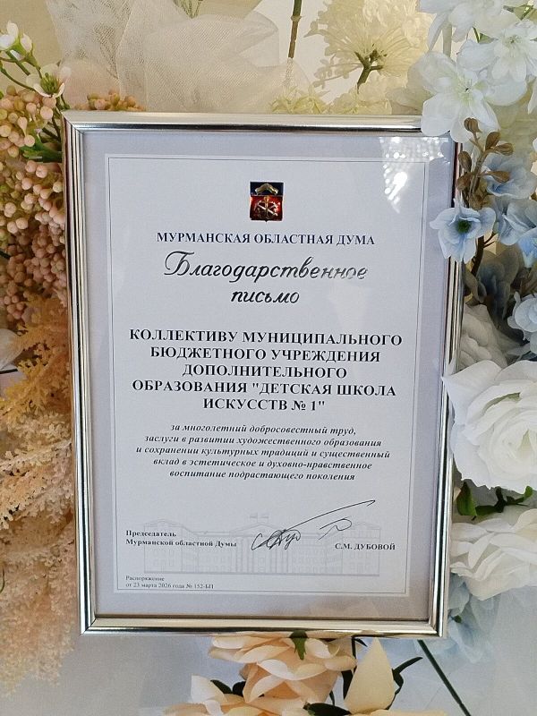 Коллектив Детской школы искусств №1 н.п. Высокий награжден Благодарственным письмом Мурманской областной Думы.