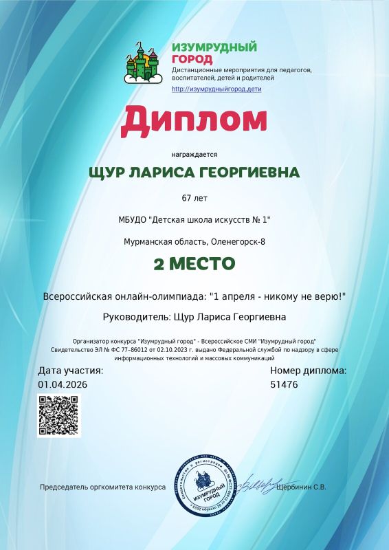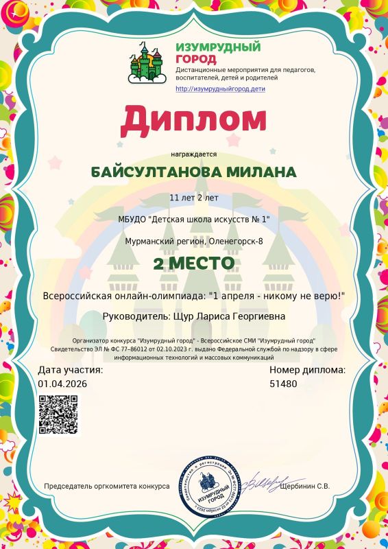 Учащиеся музыкального отделения Байсултанова Милана, Ильина Анна и преподаватель Щур Лариса Георгиевна приняли участие во Всероссийской олимпиаде " 1 апреля - никому не верю!".